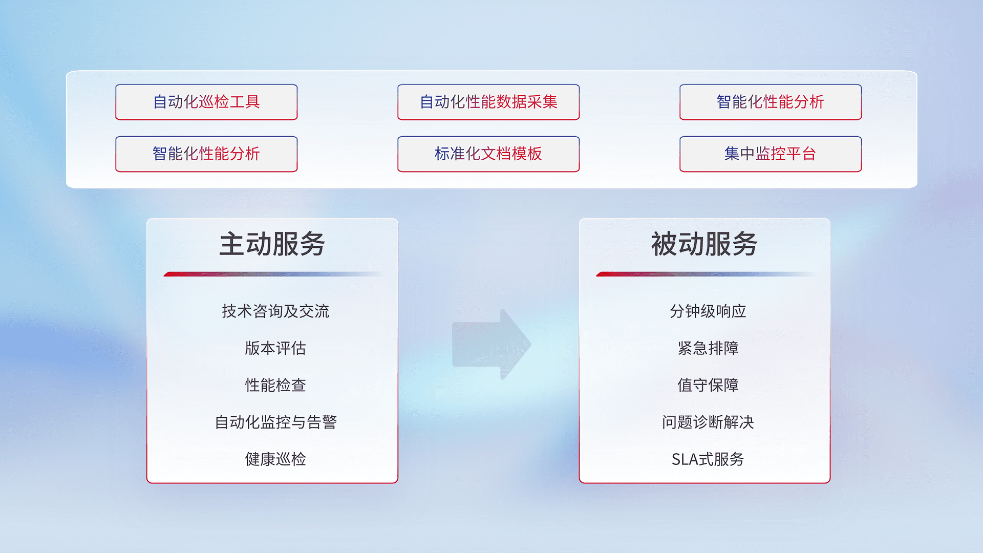 智能化工具和标准化文档,,保障服务质量,,提供主动服务(包含技术咨询、、版本评估、、、、性能检查、、、、自动化监控与告警、、、、健康巡检)和被动服务包含(分钟级响应、、、紧急排障、、值守保障、、、问题诊断解决、、SLA服务)。。。